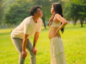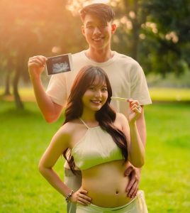 Dalam foto tersebut, mereka menunjukkan test pack dengan dua garis merah, hasil pemeriksaan USG, serta baby bump yang semakin terlihat jelas.