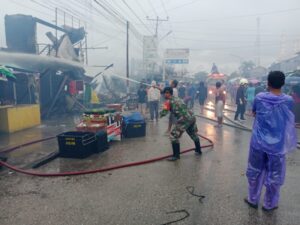 Akarkata.com, Sambas – Respons cepat ditunjukkan anggota Koramil 07/Teluk Keramat Kodim 1208/Sambas dalam membantu penanganan kebakaran hebat yang melanda kawasan Pasar Simpang Empat, Kecamatan Tangaran, Kabupaten Sambas, Minggu (25/01/2026) dini hari.