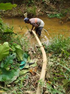 Di lapangan, personel Polres Melawi tampak bergotong royong mencari serta memanfaatkan sumber air yang tersedia di sekitar lokasi lahan.