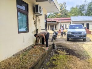 Kapolsek Menyuke secara langsung mengajak seluruh anggota untuk membersihkan area sekitar Mako, mulai dari halaman hingga bagian dalam ruangan kerja.