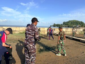 Dengan penuh semangat kebersamaan, personel gabungan bersama warga setempat bahu-membahu membersihkan kawasan pantai.