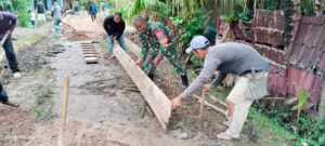 Babinsa Desa Dalam Kaum, Koramil 01/Sambas, bersama masyarakat setempat melaksanakan gotong royong pemasangan papan mal sebagai persiapan pengecoran jalan gang, Minggu (8/2/2026).