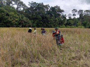 Babinsa Koramil 1206-08/Bunut Hilir melaksanakan kegiatan gotong royong panen padi bersama Kelompok Tani (Poktan) Buluh Permata Bunda di Desa Nanga Sangan, Kecamatan Bunut Hilir, Kabupaten Kapuas Hulu, Senin (9/2/2026).