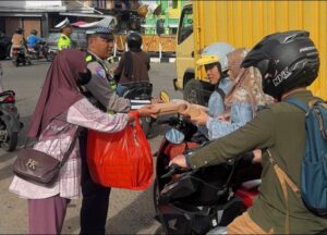 Sejak sekitar pukul 16.30 WIB, personel Satlantas telah bersiaga di lokasi untuk membagikan paket makanan berbuka kepada pengendara roda dua maupun roda empat yang melintas.