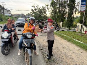 Dengan sikap ramah dan penuh kehangatan, anggota Satreskrim menyerahkan paket makanan berbuka puasa kepada masyarakat yang melintas.