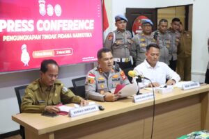 Polres Sintang menggelar konferensi pers terkait pengungkapan kasus besar peredaran narkoba di wilayah Kabupaten Sintang, Senin (02/03/2026).