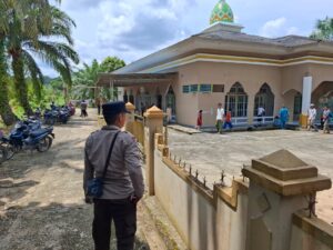 Kedua personel tersebut melakukan pemantauan situasi di sekitar area masjid, sekaligus mengawasi kondisi lingkungan guna memastikan kegiatan ibadah berjalan dengan lancar tanpa adanya gangguan keamanan.