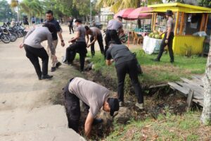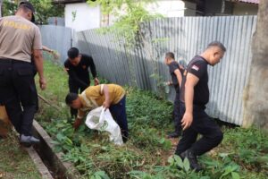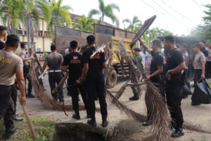 Kapolres Ketapang terlihat turun langsung memimpin kegiatan dengan ikut serta membersihkan lingkungan bersama para peserta.
