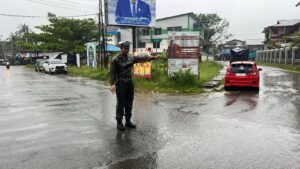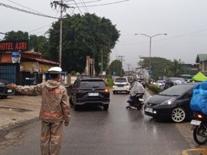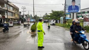 Di tengah kondisi cuaca yang basah dan jalanan licin, para anggota Polisi Lalu Lintas (Polantas) tetap berdiri di sejumlah titik strategis untuk mengatur arus kendaraan demi menjaga keamanan serta kelancaran aktivitas masyarakat.