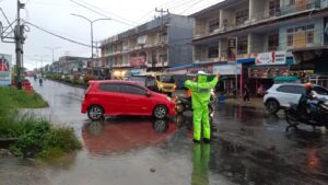 Dengan berdiri di tengah hujan dan mengatur kendaraan yang melintas, para personel Polantas menunjukkan komitmen mereka untuk memastikan masyarakat dapat melakukan perjalanan dengan aman.