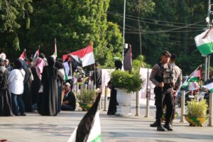 Berdasarkan pantauan di lapangan, sekitar 50 orang peserta hadir membawa spanduk serta atribut yang menyuarakan dukungan terhadap perjuangan rakyat Palestina.