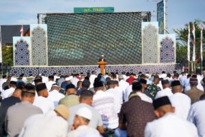 Dalam khutbahnya, ia menekankan bahwa Idul Fitri bukan sekadar perayaan, tetapi momentum untuk kembali kepada kesucian hati.