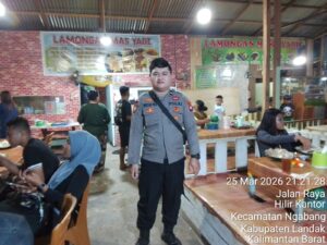 Kegiatan patroli dilaksanakan oleh Briptu Sultan WB selaku petugas piket jaga Polsek Ngabang dengan menyasar sejumlah lokasi strategis, seperti Terminal Ngabang, kawasan pertokoan, serta area UMKM yang masih beroperasi pada malam hari.