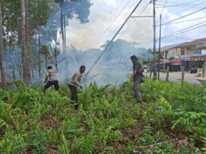 Akarkata.com, Melawi, Kalbar – Aksi sigap ditunjukkan personel Satuan Lalu Lintas (Satlantas) Polres Melawi bersama anggota Polsek Nanga Pinoh dalam menangani kebakaran semak belukar yang terjadi di area Yayasan Emaus, Jalan Kota Baru Km.4, Nanga Pinoh, Rabu (25/3/2026).