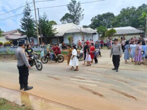 Petugas melakukan pengawasan di sekitar gereja, membantu pengaturan arus keluar masuk jemaat, serta memantau area parkir guna mengantisipasi terjadinya gangguan kamtibmas.
