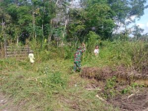 Selain memotong rumput, personel TNI bersama warga juga membersihkan saluran drainase dan mengangkut sampah organik agar area sekitar tetap bersih dan nyaman.