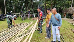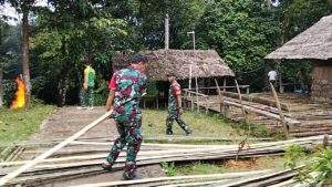 Personel Koramil 1209-07/Jgb bersama masyarakat melaksanakan kegiatan Karya Bakti berupa perehaban Rumah Betang (Boli Botang) di Dusun Jagoi Babang, Desa Jagoi, Kecamatan Jagoi Babang, Kabupaten Bengkayang, Jumat (24/4/26).